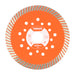 A premium quality diamond blade, manufactured to give professional and long lasting results. It uses a high grade hot pressed diamond cutting edge and laser welding technology for maximum cutting performance, lifespan and vibration resistance. The continuous turbo cutting edge assists self cooling while cutting, allowing the diamond material to stay sharper, for longer. Suitable for the hardest materials on site, including reinforced concrete, granite, engineering bricks, kerbs and more.